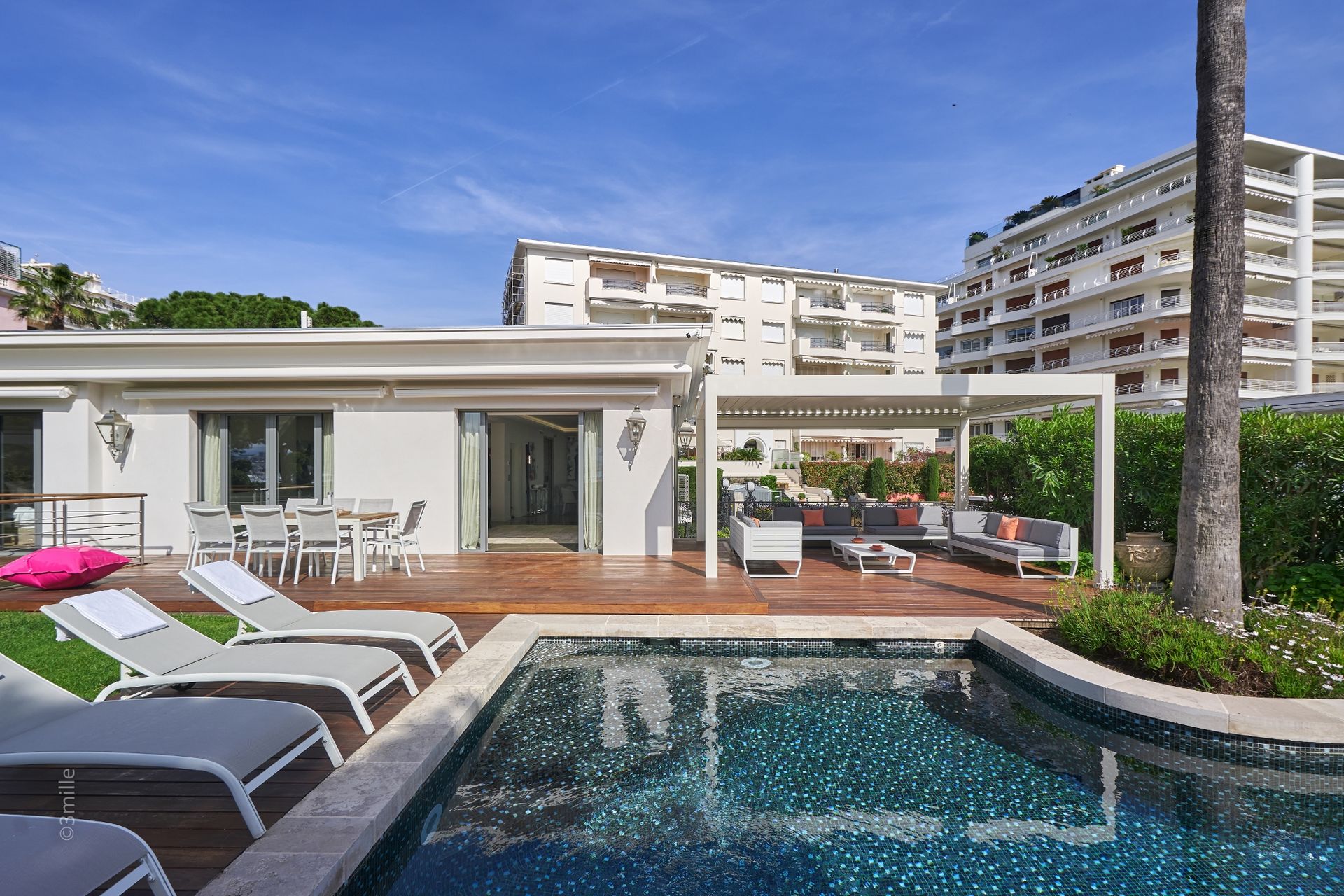 Villa di lusso con piscina in affitto Cannes Croisette. Lussuosa e moderna villa di fronte a Port Canton di 350mq di superficie abitabile in un giardino paesaggistico di 900mq con piscina di 5m x5m. Composta al piano terra da 4 camere con bagni, ufficio, sala massaggi.