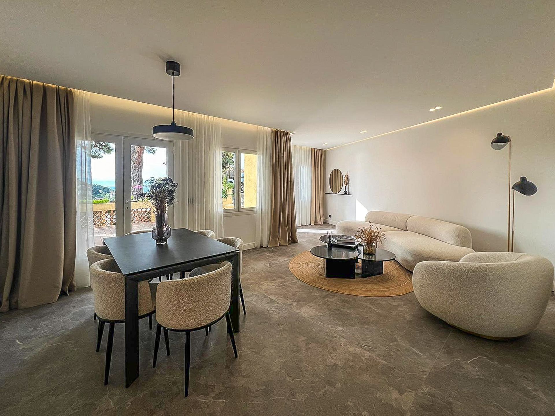 Lägenheten, helt renoverad med exklusiva material, består av ett vardagsrum som vetter mot en stor 44m² terrass med utsikt över havet, ett fullt utrustat kök i öppen planlösning, två sovrum med varsitt badrum.