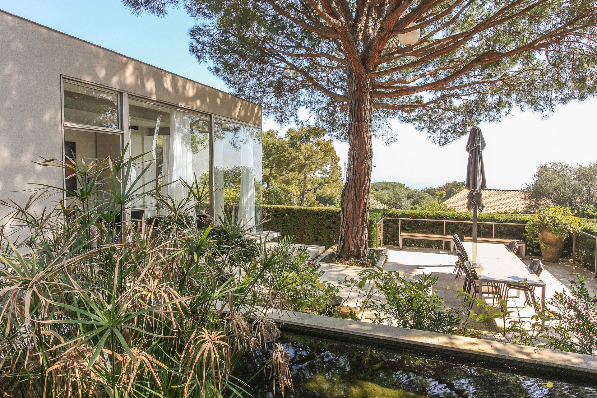 This modern villa captivates with its magnificent landscaped garden, large swimming pool, and breathtaking views of the sea and pine trees.